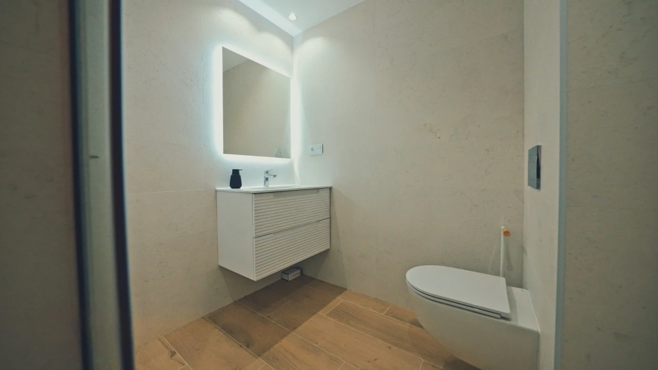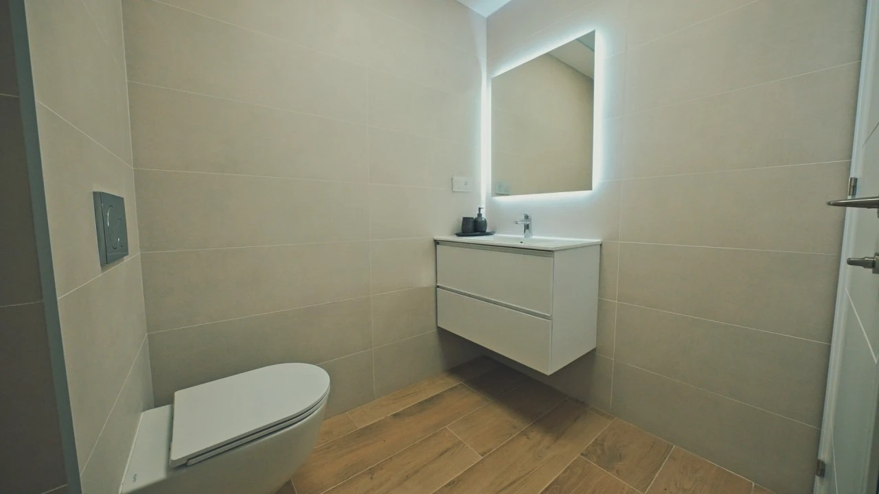 There is: parking, dining area, green zone, A/C pre-installation, аerotermia, built-in wardrobe, partly furnished, gym, double glazing, PVC windows, private residential complex, window shutters.