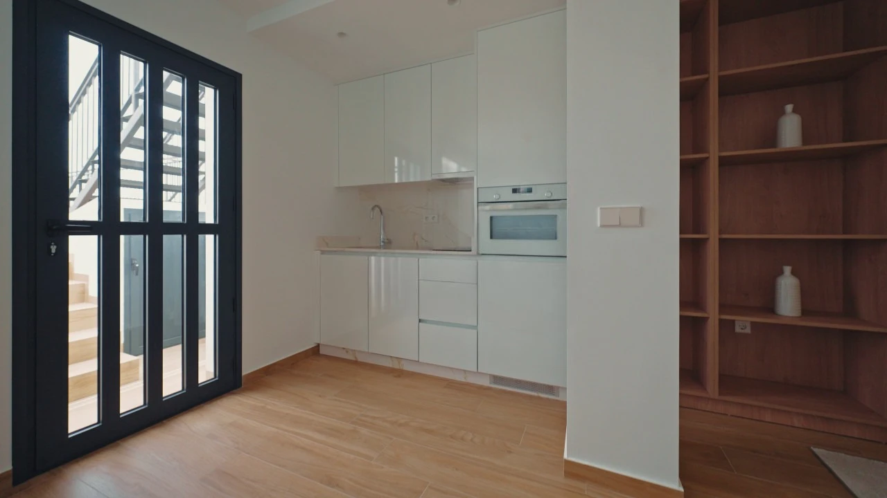 There is: open parking, pantry, underfloor heating, A/C pre-installation, аerotermia, built-in wardrobe, partly furnished, elevator, aluminum windows, double glazing, household appliances, security door.