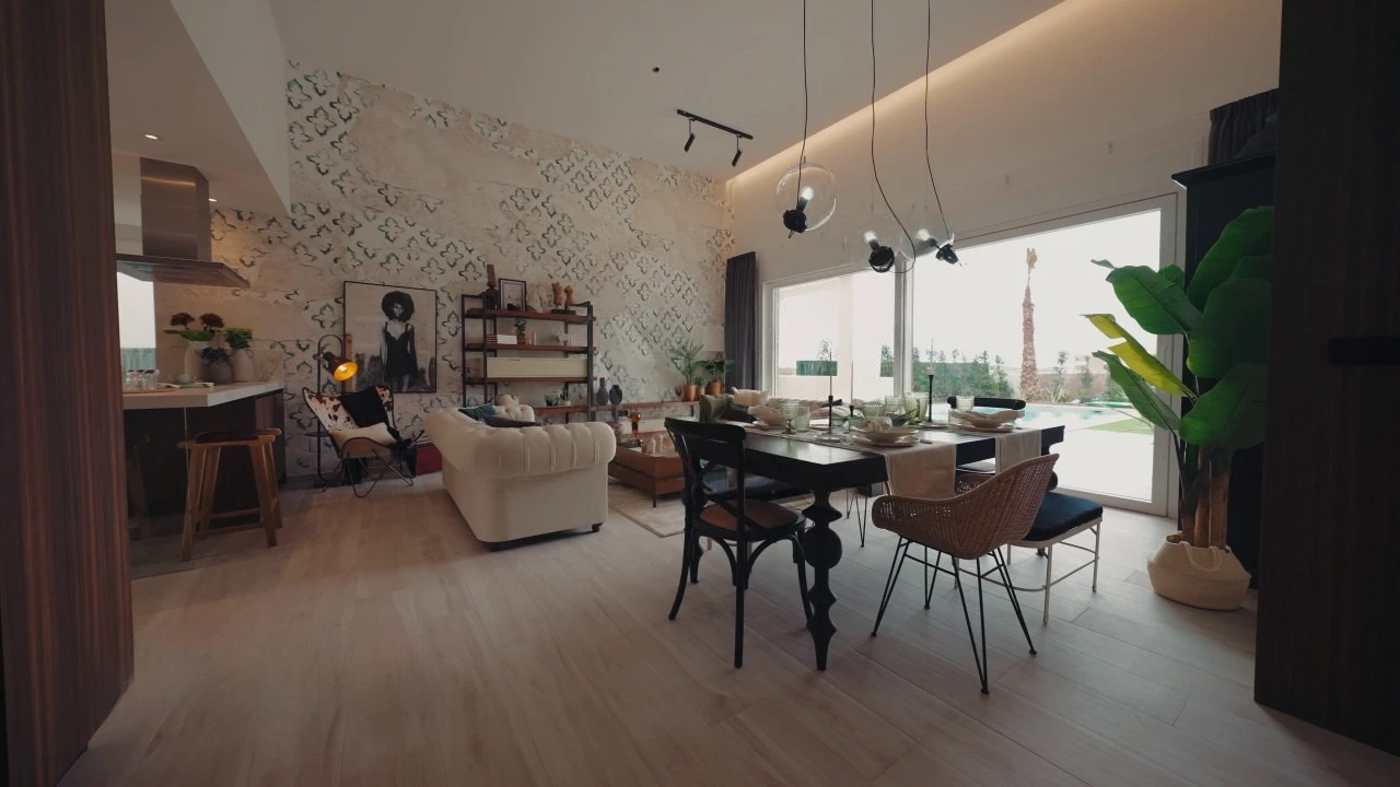There is: open parking, сovered garage, dressing room, dining area, green zone, underfloor heating, central air-conditioning, built-in wardrobe, fully furnished, double glazing, PVC windows, american kitchen, household appliances, electric blinds.