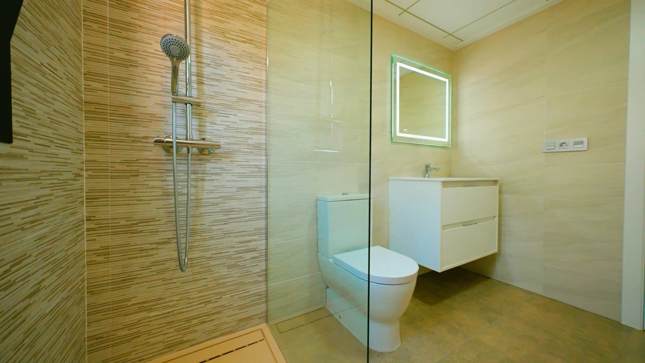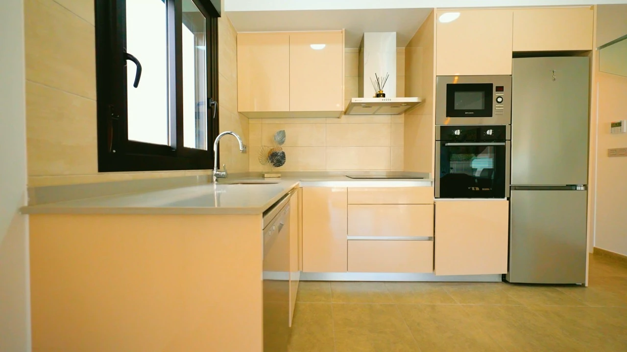 There is: pantry, dining area, green zone, A/C pre-installation, аerotermia, built-in wardrobe, partly furnished, aluminum windows, double glazing, household appliances, microwave, stove, dishwasher, washing machine, refrigerator, private residential complex, security door, window shutters.
